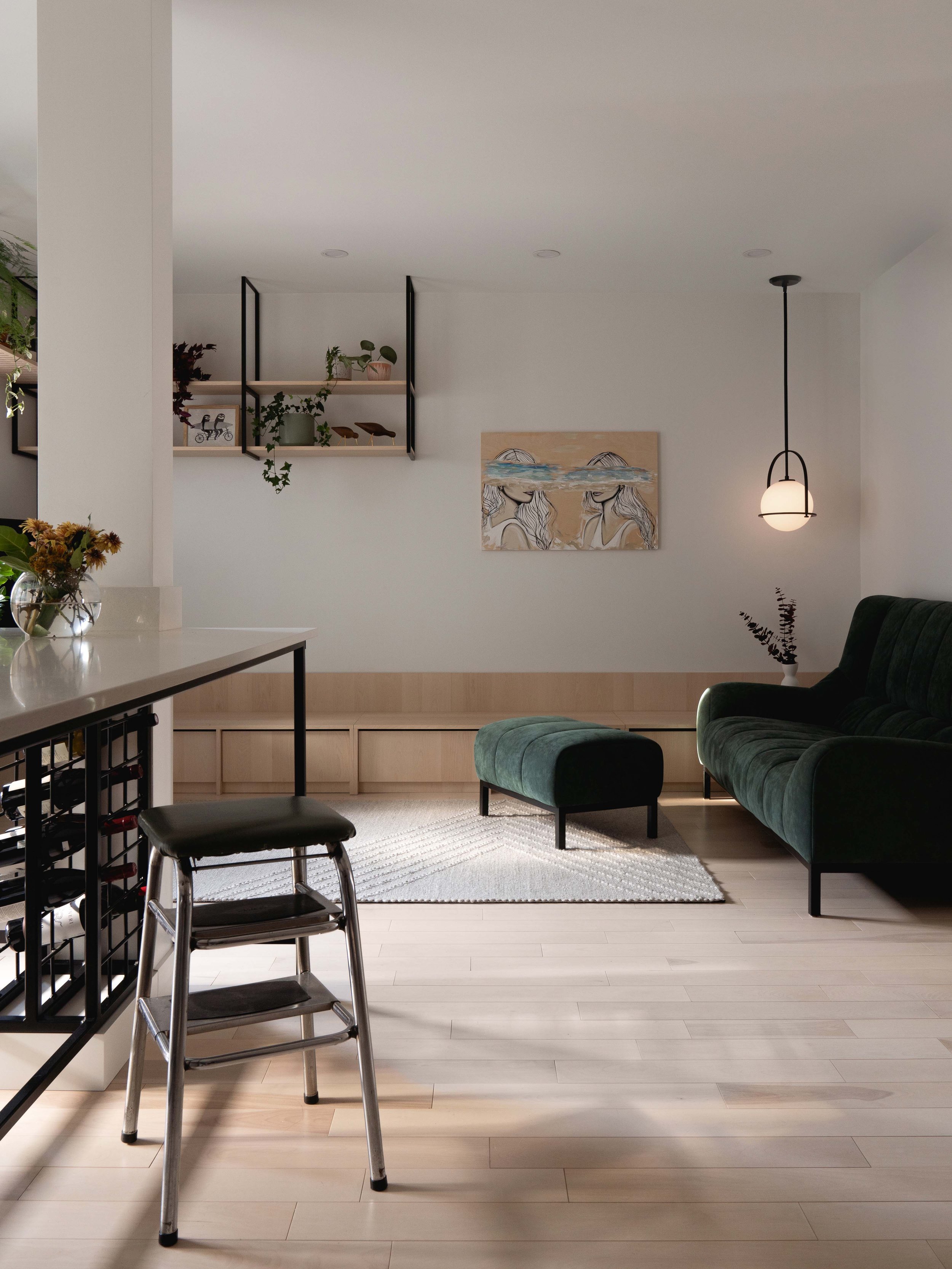 La chambre a été conçue sur une plateforme intégrant du rangement dissimulé, optimisant chaque centimètre disponible. Le bureau, quant à lui, combine un vaste espace de rangement et un lit escamotable, permettant de transformer la pièce en chambre d’appoint lorsque nécessaire. Dans le salon, une grande banquette sur mesure avec rangement intégré vient ajouter à la fois confort et fonctionnalité.