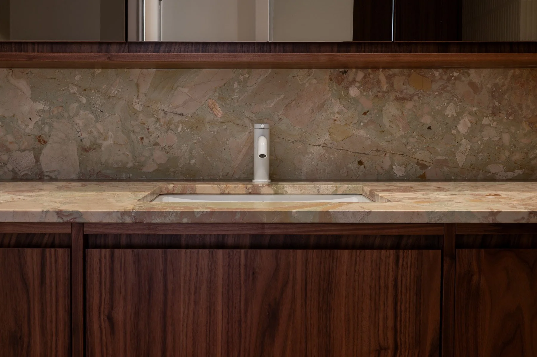 La réalisation, exécutée avec finesse par l’entrepreneur et l’ébéniste, souligne la rigueur du design et en révèle toute la richesse. Les teintes chaudes s’harmonisent naturellement : céramique couleur sable, noyer et pierre aux nuances beige, rosées et vert pâle composent une palette enveloppante où textures et matières créent une atmosphère à la fois douce et intemporelle.